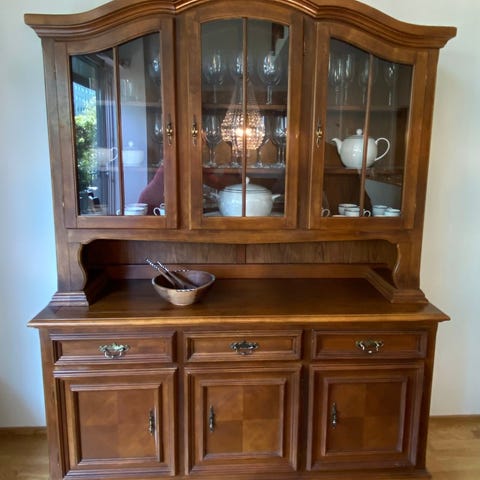 Et helt spesielt vitrineskap fra 1947 selges til deg som setter pris på ekte håndverk og sjel i interiøret. Dette veggskapet er laget i heltre, med et vakkert, håndskåret motiv av en norsk stavkirke og dekorative utskjæringer – alt signert med "ANNO 1947" på fronten.