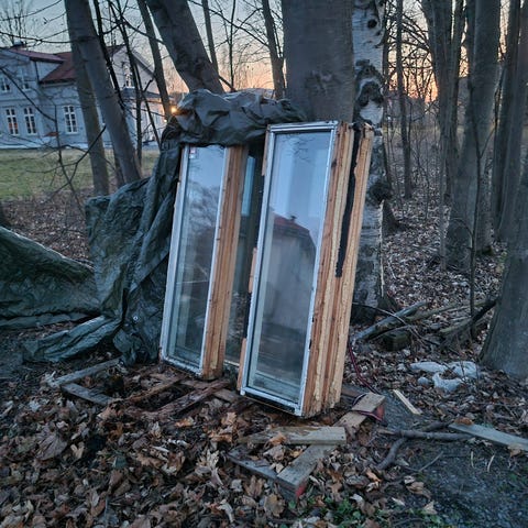 Tre vinduer jeg henter til mitt hjemmebygde drivhus. Disse var litt tunge, og fikk ikke plass i drivhuset denne gangen. De kan fint brukes nederst i en vegg eller hvis du har ei solid ramme/reisverk.