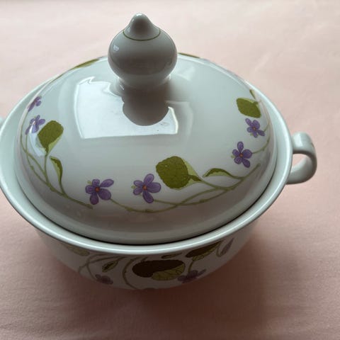 Figgjo Safran pepperbøsse. Blank og fin uten krakkelering, skår eller nagg. Dekoren ikke falmet, men der er noen flekker i godset som jeg tror det er vanskelig å fjerne, se bilder. Selges derfor rimelig for en 100-lapp. Propp i bunnen inntakt.