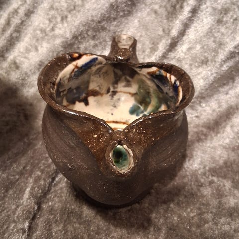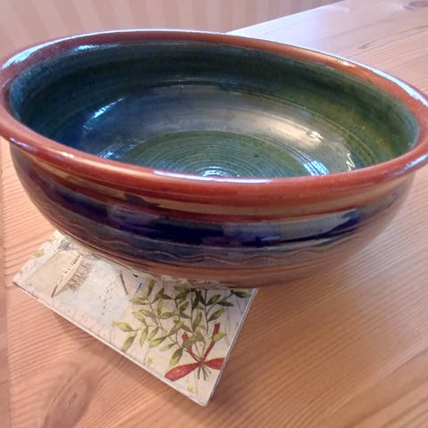 Håndlaget studiokeramikk i skandinavisk stil. Organisk form og levende glasur i naturlige jordtoner med blågrønne nyanser. Signert av keramiker på undersiden. Et unikt objekt – ingen to er like. Egnet som dekor eller kunsthåndverk i interiør.