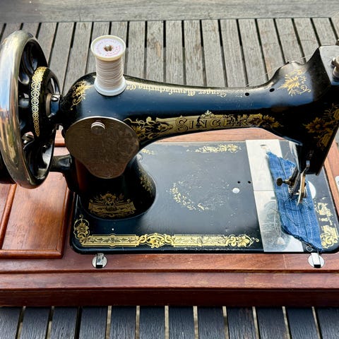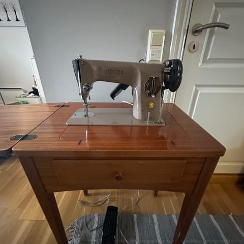 Komplett symaskin fra Singer, modell 201K23. Kjøpt i 1957, original kvittering og bruksanvisning medfølger. Selges til høystbydende. Hentes i Engelsviken.
