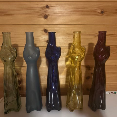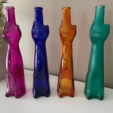 De er formet som en katt og er veldig dekorative. Flaskene er populære samleobjekter og blir ikke produsert lenger. Vanskelig å få tak i og en sjelden mulighet!