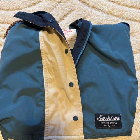 Glidelås ved halsen og på sidenne. Stor lomme med glidelås foran, og to lommer på siden.