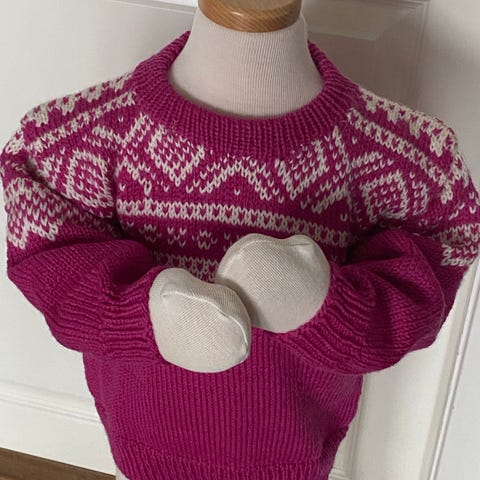 Nystrikket Marius sett genser/ bukse i str. 2 år selges for kr. 849,00 pr. sett + porto. Har 1 sett i mørk rosa + 1 sett i blå og 1 sett i fin grønnfarge. Underarm er ca. 30 cm hel lengde på genser er 42 cm . Skrittlengde på bukse er 37 cm , hel lengde på bukse er ca. 57 cm. Jeg kan sende dette uten fiks ferdig om du ønsker, så blir det billigere porto.