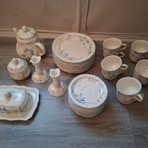 Selger serveringsdeler til servicet Riviera fra Villroy&Boch. Pent brukt, ingen merker. Selges samlet. Inneholder: En salatbolle/skål, 25 cm, to skåler 18cm, en bolle 21cm, en bolle 15cm, et avlangt serveringsfat 29cm langt, et rundt serveringsfat ca 35cm og to sausenebb. Dype og flate tallerkener ligger i en egen annonse.