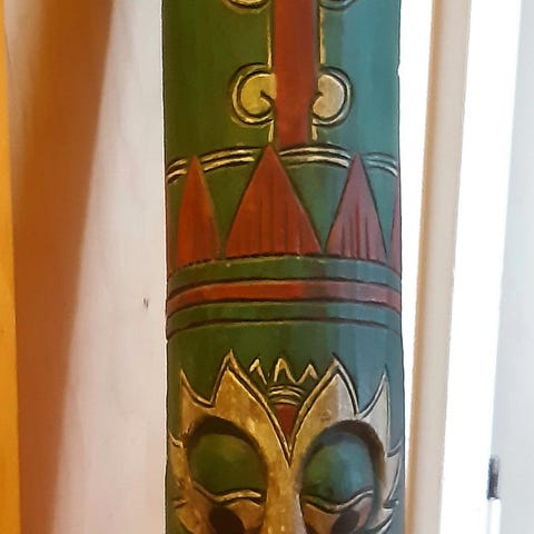 Masken måler 57 cm., bredde ca. 11 cm. på bredeste punkt. Flott detaljer, skåret ut i mørkt tre, dekorert i fargene lys rosa, rosa, rødt, grønt, svart og detaljer med bladgull. Noe små slitasjepunkter på bakside, masken er ca. 30 år gammel. Flott sak å pynte veggen med. Selges kr. 150, må hentes i Hunndalen nær Gjøvik.