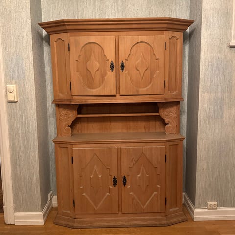 Unikt og solid skap i klassisk fransk landstil – også kjent som en armoire. Skapet er laget i heltre med vakre utskjæringer, buet topp og messingbeslag. Svært god plass med både hyller og 8 innvendige skuffer. Kan brukes til oppbevaring, som vitrineskap, klesskap – eller som en elegant løsning for å skjule TV og ledninger.