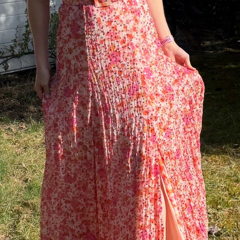 Helt ny, nydelig kjole fra Timo. Romantisk og elegant print i tynn og lett stoff som faller veldig pent. Hemper på innsiden av utringingen.