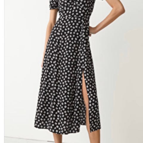dame kjole med polkaprikker, strikk i ermene og i midjen, glidelås i siden, splitt i leggen, størrelse xs-s.