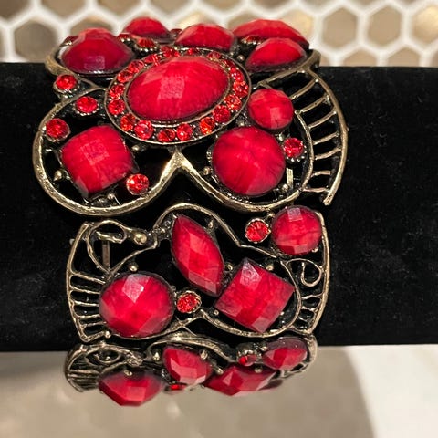Et vakkert fairycore armbånd cuff i antikkgull og lilla farge (metall med plaststeiner). Åpent og elastisk så det passer mange størrelser (se bilder) Bredde 4cm og diameter fra 5 til 8 eller mindre/mer da de former seg rundt armen.
