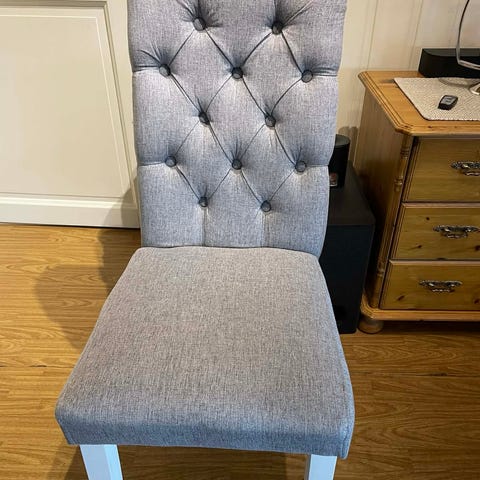 Pent brukte stoler med lysegrått trekk og mørke ben selges samlet for kr 2000.