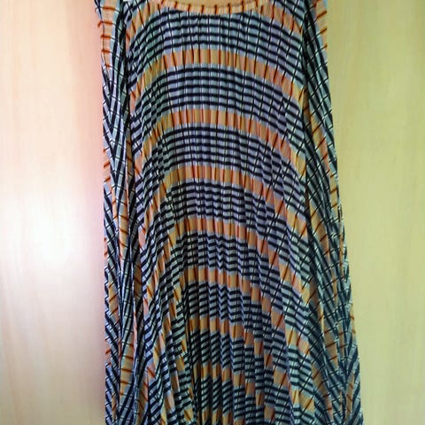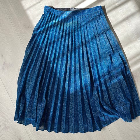 Flott Samsøe plissert jersey midi skjørt med vanlig passform. Elastisk linning og kan passe både S og M i størrelse. Modellbildet er i blå farge og ikke turkis som dette skjørtet, men viser fint passformen/lengde.