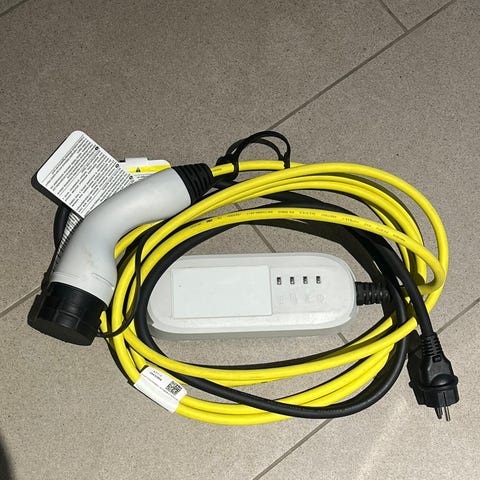 Original Mode 2 el‑bil lade‑kabel (Type 2) produsert av TE Connectivity for VW/Audi/Skoda. 6 m lang og beregnet for 230 V stikkontakt (8 A, ca. 3.6 kW).