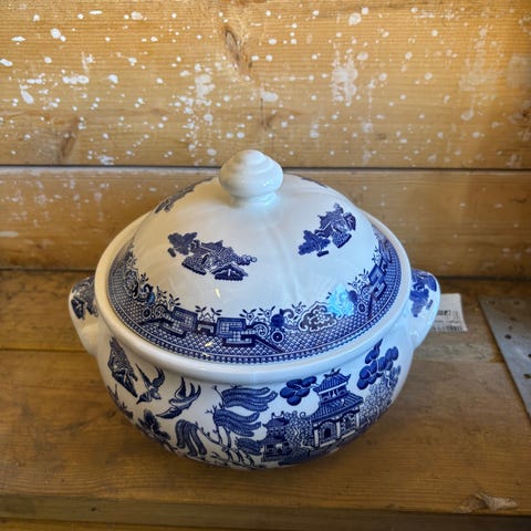 Clemetson bros england lincoln oval terrin laget av porselen i blå og hvit farge.