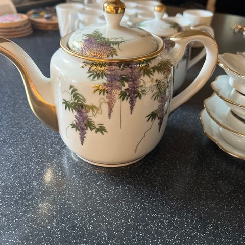 Settet er laget av fint beinporselen og har detaljer i gull.