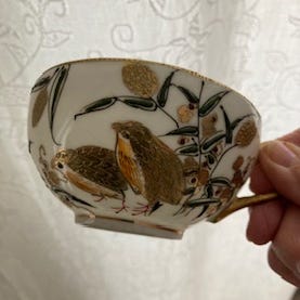 Nydelig japansk mokkakoppsett. Kaffe-/teservise med pedestal/pidestall form perlemor, gull og smaragdfarget i delikat porselen ca. 1960.