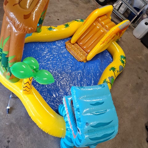 Plastballer, oppblåsbare små ringer og oppblåsbar apekatt mangler. Hodet til flodhesten har hull i seg så kan ikke blåse opp hodet. Ellers alt i orden.