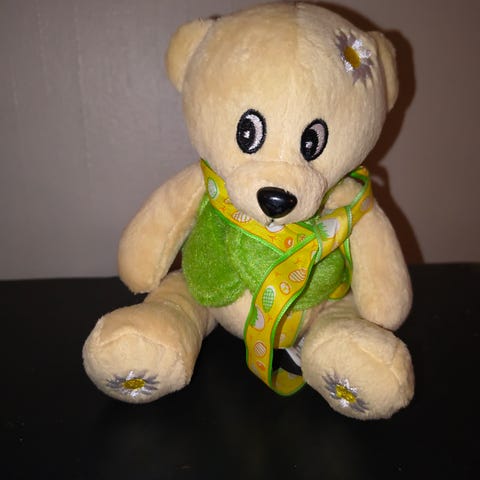 Sjarmerende teddybjørn i grønt stoff. Laget i Thailand. Knapper av kokosnøtt. Se også mine andre annonser. Kan sende flere i samme pakke. Kan sende for 69 kr med postnord om jeg bestiller porto.
