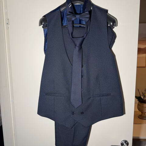 Jakke og bukse er i størrelse 56 som sitter pent på.