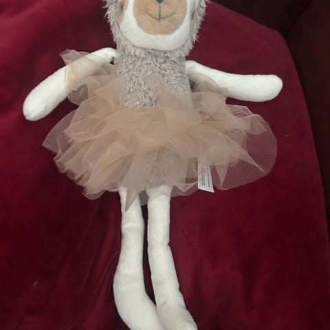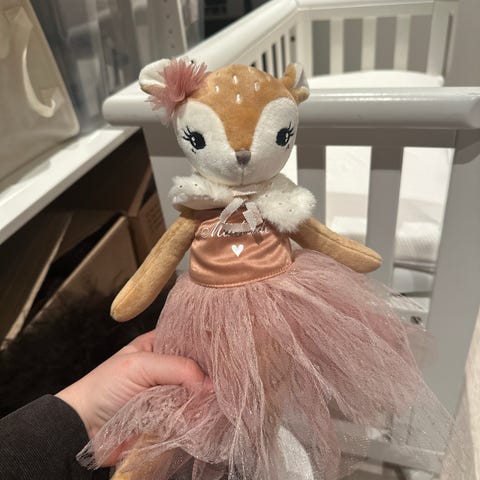 Svane bamse fra Kid.Stått mest til pynt. Det ene sløyfebåndet er litt rufsete,kan event klippes av.Gått litt opp i limingen på kronen,men kan limes på nytt.Ellers i fin stand.