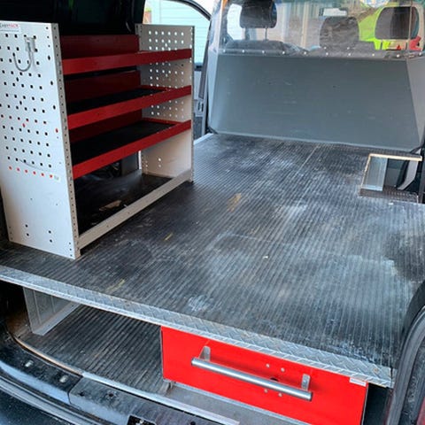 Bil innredning med hyller og skuffer til å ta med som kofferter, og med skruvinje på siden bord som trekkes ut.