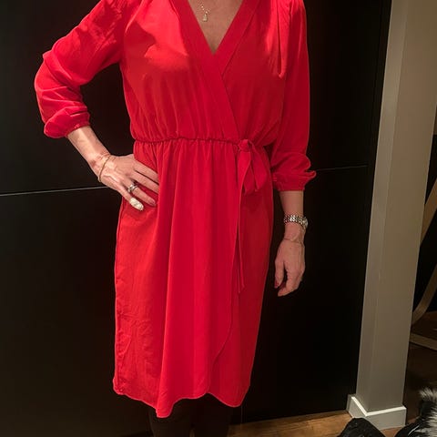 Deilig og komfortabel rød kjole med 3/4 ermer og stripet tekstur. Nice og flowy med deilig stoff (polyester). Perfekt til jul og julebord.
