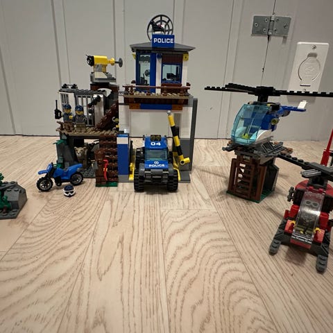 LEGO City lekesett med flere kjøretøy, bygninger og figurer. Settet inkluderer en politistasjon, helikopter, biler og båter, samt ulike minifigurer og tilbehør. Passer for barn som liker å bygge og leke med byscenarier.
