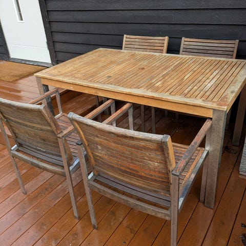 Applarø spisebord med 6 stoler selges. Er plass til 8 stoler, men vi har bare 6. Bordet har klaffer på begge sider slik at bordet utvides, se bilde. Puter følger med, se bilde. Settet trenger et lakkstrøk. Må hentes i Kongsberg.