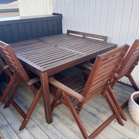 Bord 120 cm X75, 4 stoler og 1 parasoll selges. Hagegruppen er klassisk og flott! Den er nyoljet og klar til bruk.