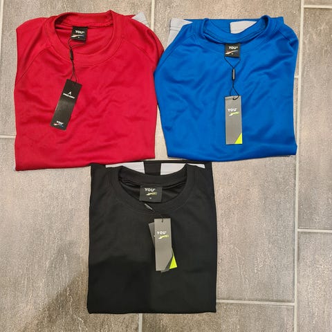 Selger tre helt nye og ubrukte treningst-skjorter i størrelse L. Perfekt for trening, løping eller fritid! Alle er i teknisk pustende materiale som transporterer fukt og holder deg komfortabel.