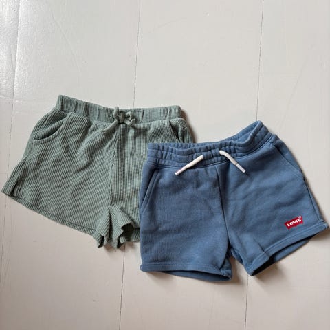 5 korte shortser og 1 knelang hvit sommerbukse. Shortsen med iskremene på står det str 80 i, men her har den vært brukt like lenge som de andre.