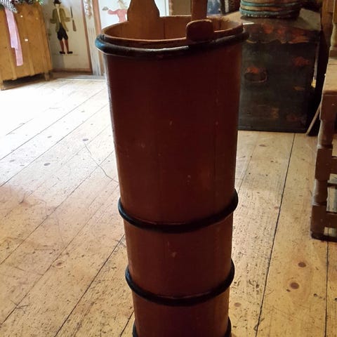Alder ukjent,men trolig fra andre halvdel av 1800-tallet.Kjøpt på auksjon ca 1960.Stått til pynt.Preget av bruk,men ellers i god stand,lokk og stav er med,lite hull i bunnen.Høyde 66 cm,die 25 cm.Må hentes,kan også hentes i Oslo.