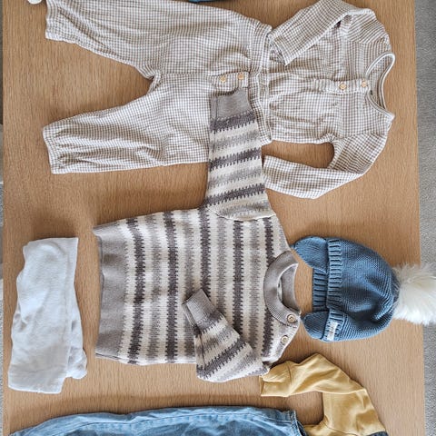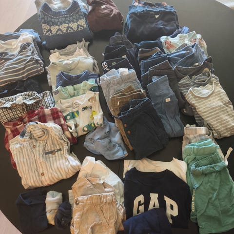 Selger en stor pakke med klær til gutt i str. 6–9 måneder.