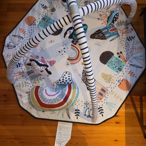 Lekematten er vendbar og er grønn på den ene siden og grå på den andre siden.