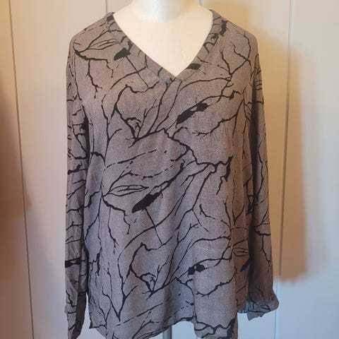 Beige bluse med lange ermer og v- hals med sort mønster, selges grunnet opprydding. Ikke vært brukt, lappe henger på. Ord kr 899. Sendes med tjenesten Helthjem, eller kan hentes på Kleppestø/Askøy.