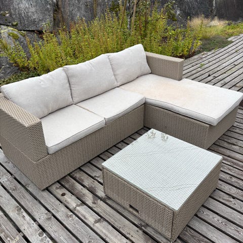 Sittegruppe fra Rusta, pent brukt. Sofaputene er noe solbleket.