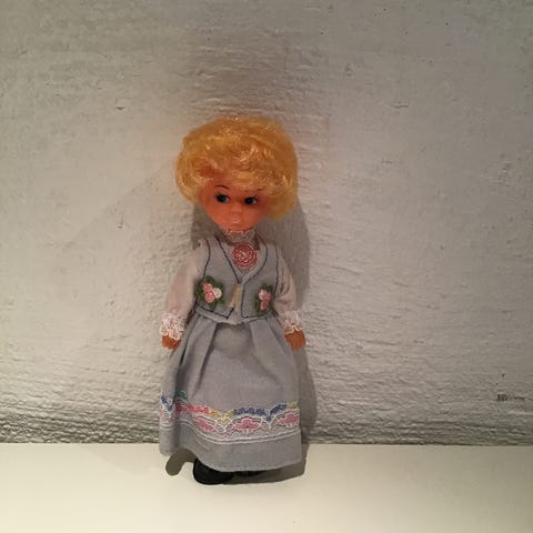 Selger en liten sittende dukke iført en enkel kjole, den mangler dessverre ben, og derfor en sittende figur. Den har et beskjedent og nostalgisk uttrykk, og passer fint som pynt eller som del av en samling med vintage leker.