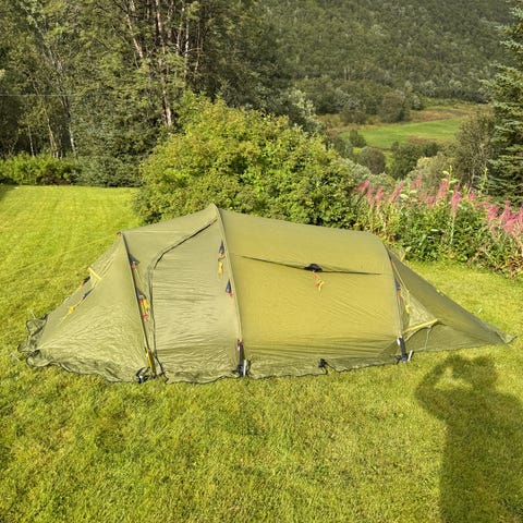 Eldre fjelltelt for 3 personer. Innertelt, oransje, med to dører, en myggnetting og en tett. Yttertelt, grønt, med plass for bagasje. Lufting i toppen som kan lukkes. Det mangler en bardun, men det kan lett fikses. Det følger med pose til stenger og telt, 20 teltplugger. Vekt ca 5 kg. Selges høystbydende over kr 450