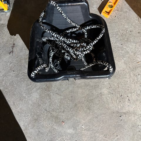 Leveres med opphengstau, bøyle i front og belte for feste av barnet når det sitter i huskesetet.
