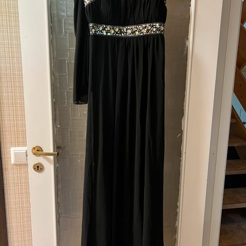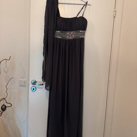 Kjempefin svart ballkjole/penkjole med diamanter på brystpartiet. Det følger også med et sjal. Det står str 8 og den er brukt av en størrelse xs/s så vil si den tilsvarer det i størrelse.