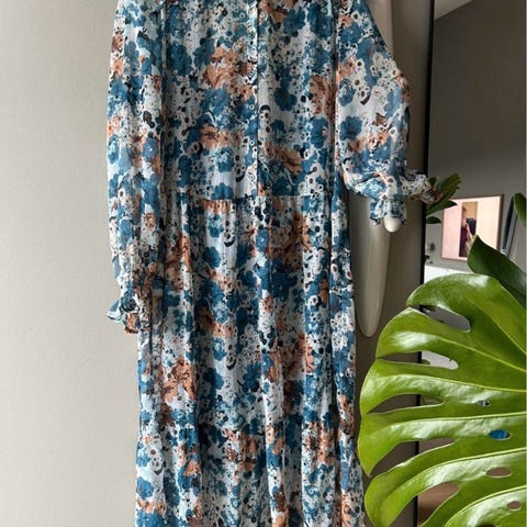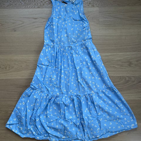 Selger en helt ny og nydelig småblomstret kjole i mørkeblått, turkist, hvitt og sort fra KappAhl. Str. large (tilsvarer 42/44). Lett, litt ruglete polyesterstoff som ikke krøller. (Tok feil størrelse fra prøverommet, og oppdaget det for sent.) Ubrukt, og lappen er fortsatt på.