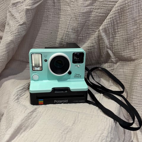 Polaroid OneStep2 kamera i mint farge. Dette kameraet er en del av Polaroids ikoniske linje med instant-kameraer. Designet for å være brukervennlig med en enkel knapp for å ta bilder. Kameraet har en innebygd blits og et kraftig batteri som varer lenge. Perfekt for å ta umiddelbare bilder med en retro stil. medfølger en Polaroid Reiseveske.
