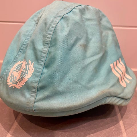 Selger en norskbrukt hjelm i Kevlar. Dette er modellen som ble tatt i bruk for FN- og NATO-personell på midten av nittitallet. Jeg brukte tilsvarende hjelm i Libanon i 1996 og 1997.