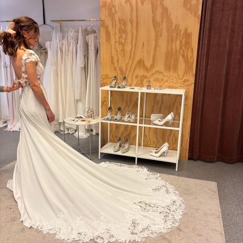 Kjøpt ny ved Kristins brudesalong i 2022. Ble dessverre ikke brukt grunnet graviditet. Kun gjort små justeringer hos skredder som sydd opp litt på skuldre og lagt inn bh-kopper. Jeg er 177 cm høy og da var lengden perfekt med et par cm hæl. Totalpris inkl skredder ca 15.000,-