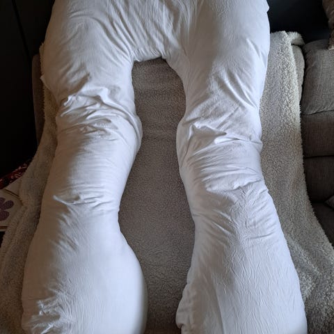 Stor og deilig kroppspute brukt under graviditet. Litt nuppete i det ene trekket, men det følger med et helt nytt og ubrukt trekk i tillegg.