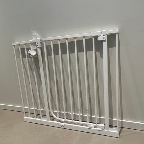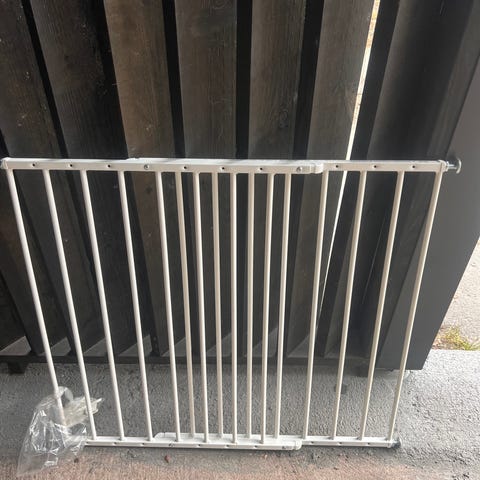 Trygg og praktisk sikkerhetsgrind fra Troll, med lameller i hvitlakkert tre. Sikkerhetsgrinden er både sammenleggbar og svingbar. Porten er kuttet til ca 95,5cm, men kan kuttes kortere om behov.