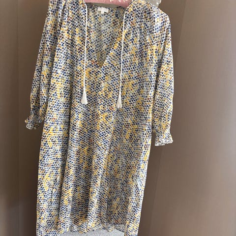 Kjolen har et veldig spennende og flatterende snitt, med kroppsnær fasong. V-utringning foran, stoffet samles sammen foran i en ring, med glidelås bak. Med splitt foran, går til leggen når du er litt høy. Jeg er kun 1,63, da er det en lang kjole Litt kortere foran enn bak. Lange armer med strikk nederst. Normal på størrelsen. Kjolen er foret.