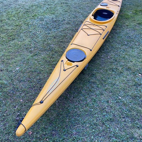 Hasle explorer havkajakk tilsalgs.pent brukt med nye strikk på dekk.Har byttet ut noen bolter/wireklemmer som var rustet.nye tau til roret.gummilokkene over bagasjerommene er helt fine og myke.Ikke morkne.Endel skrap under vannlinjen,men ingen hull/sprekker.Padleåre,vest og spruttrekk følger med.vest 70-90kg.Åre222.5cm