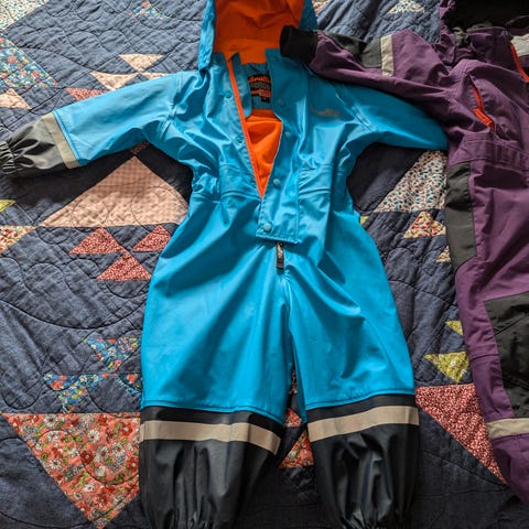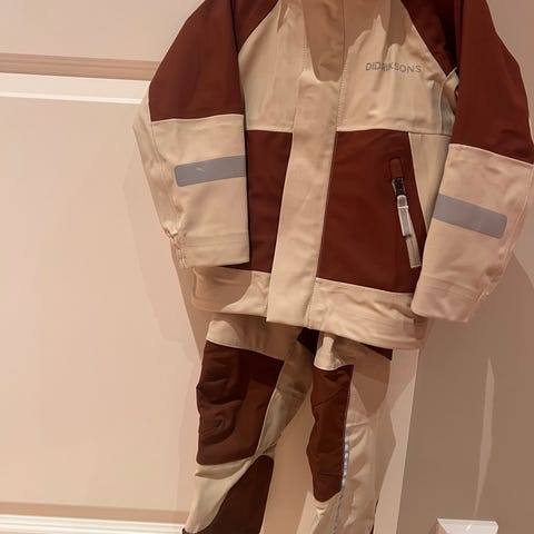 Praktisk regnsett med fleecefôr. Størrelse 80, men stor i størrelsen syns vi. Brukt noen få ganger, da sesongen og størrelsen ikke har vært helt match her.