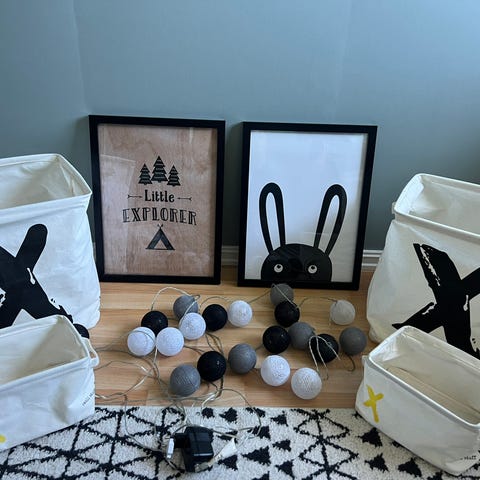 Puslespill fra Moomin (mummitrollet), hvit kosepute, mintfarget pute fra Ferm Living, blå bamse, hvit hundebamse, blå hai-bamse og to mintfargede skåler med lokk i metall.